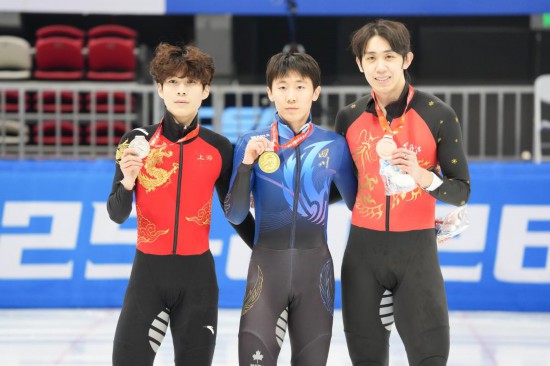 3月21日,冠军张柏浩(中)、亚军张子夏(左)和季军马威在2025-2026赛季全国短道速滑冠军赛男子500米项目颁奖仪式上。新华社记者 连振 摄