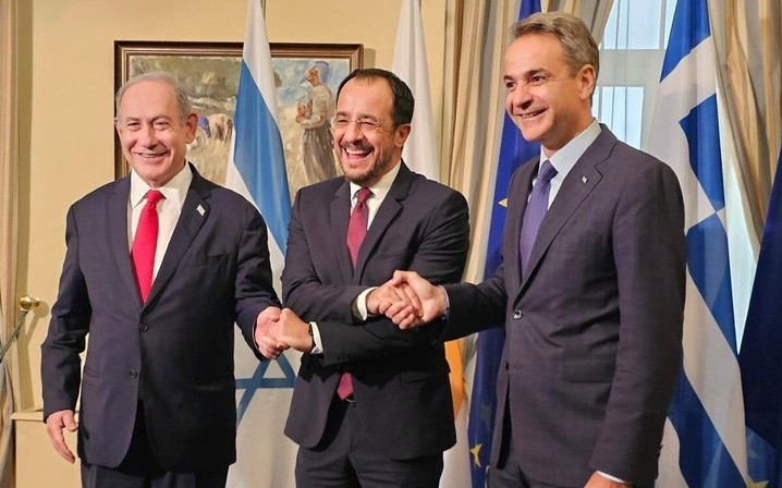 △以色列总理内塔尼亚胡(左)、塞浦路斯总统赫里斯托祖利季斯(中)和希腊总理米佐塔基斯(右)