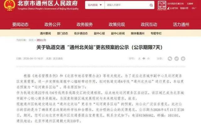 公告中提到,此次公示的目的是为了确保更名决策的科学性和合理性,充分吸纳公众的反馈意见。公示期为2026年4月13日至20日,期间,您可以向北京市通州区交通委提出宝贵意见。